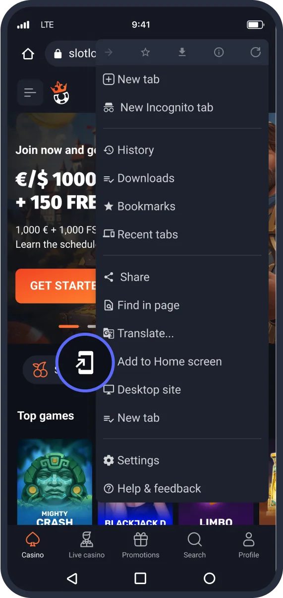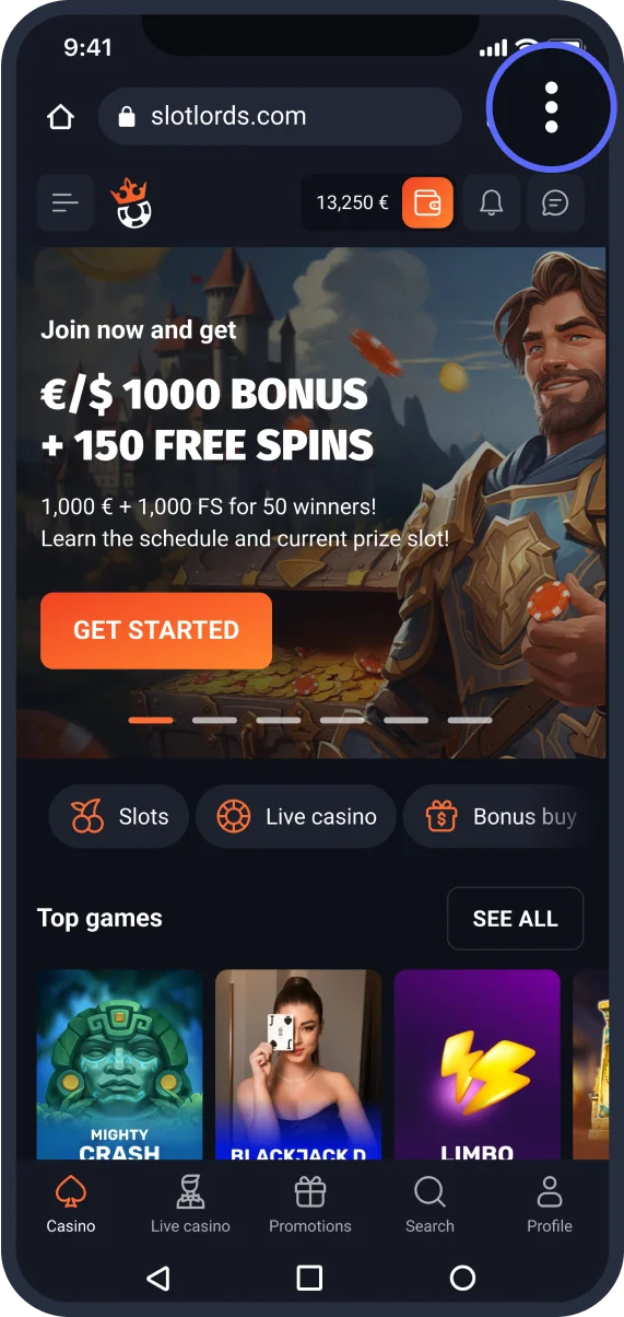Go to the SlotLounge homepage and tap three dots to open the browser menu.